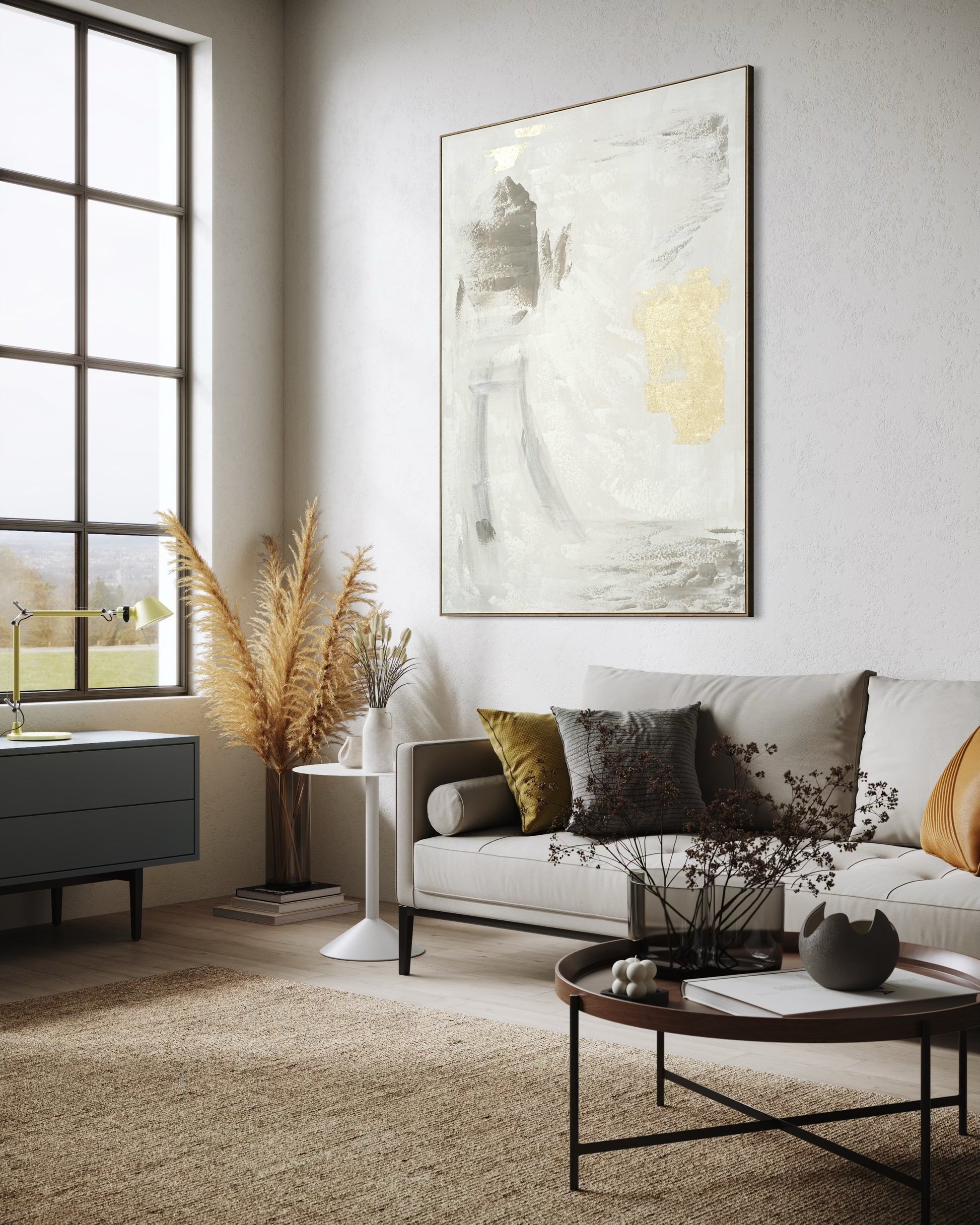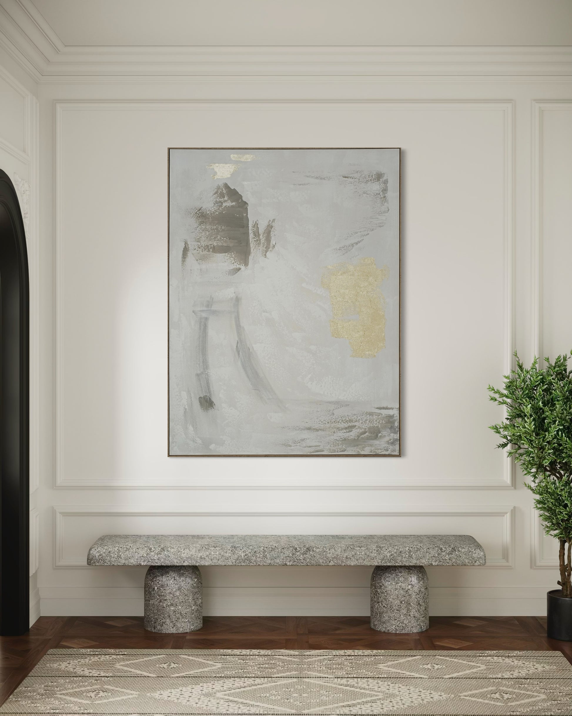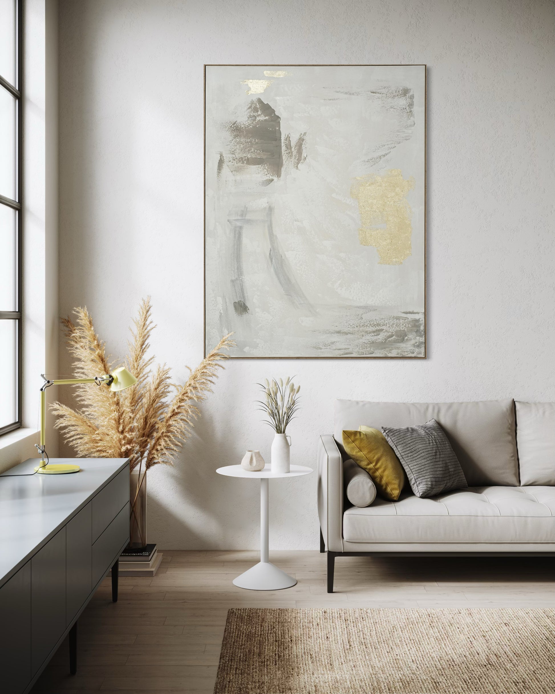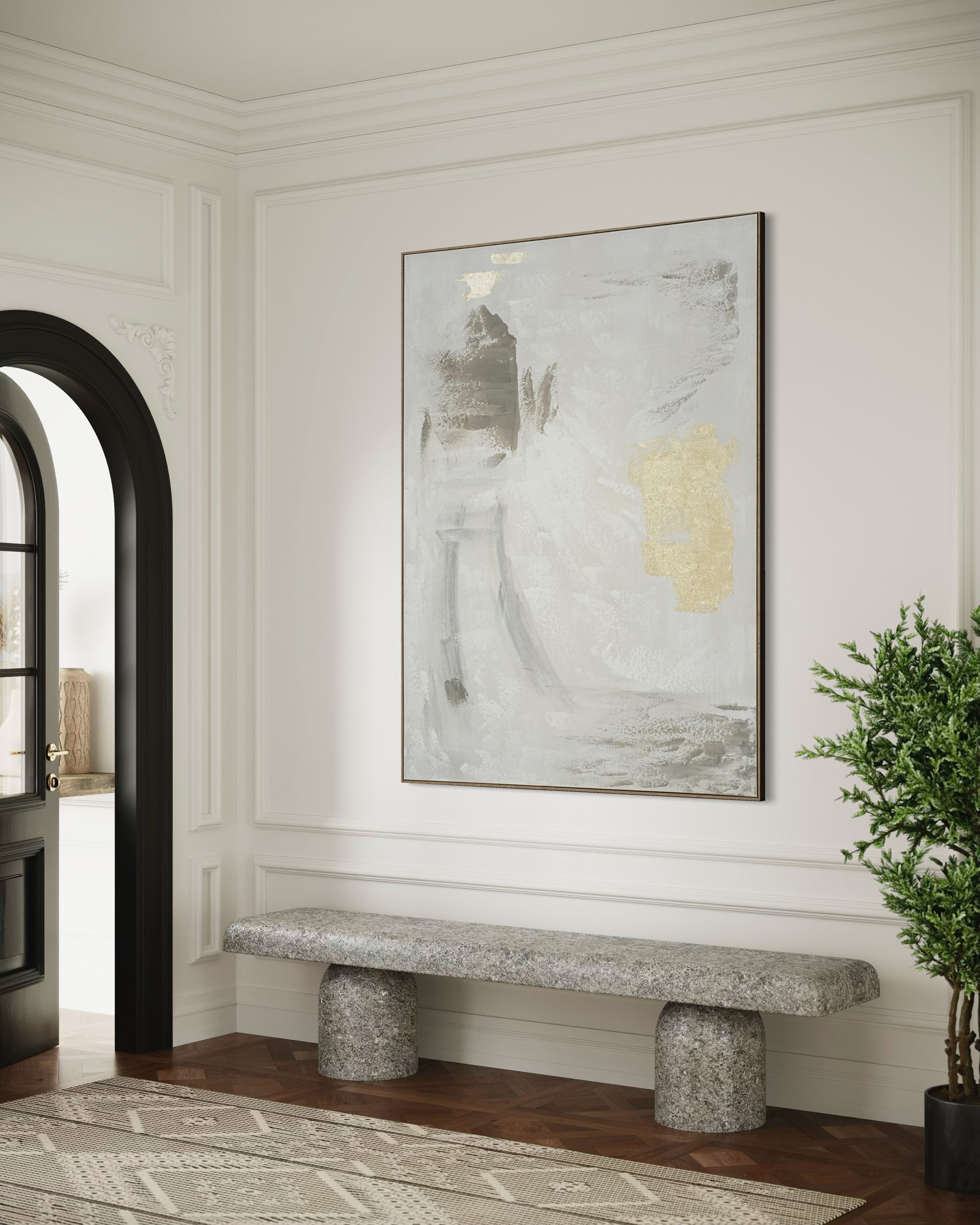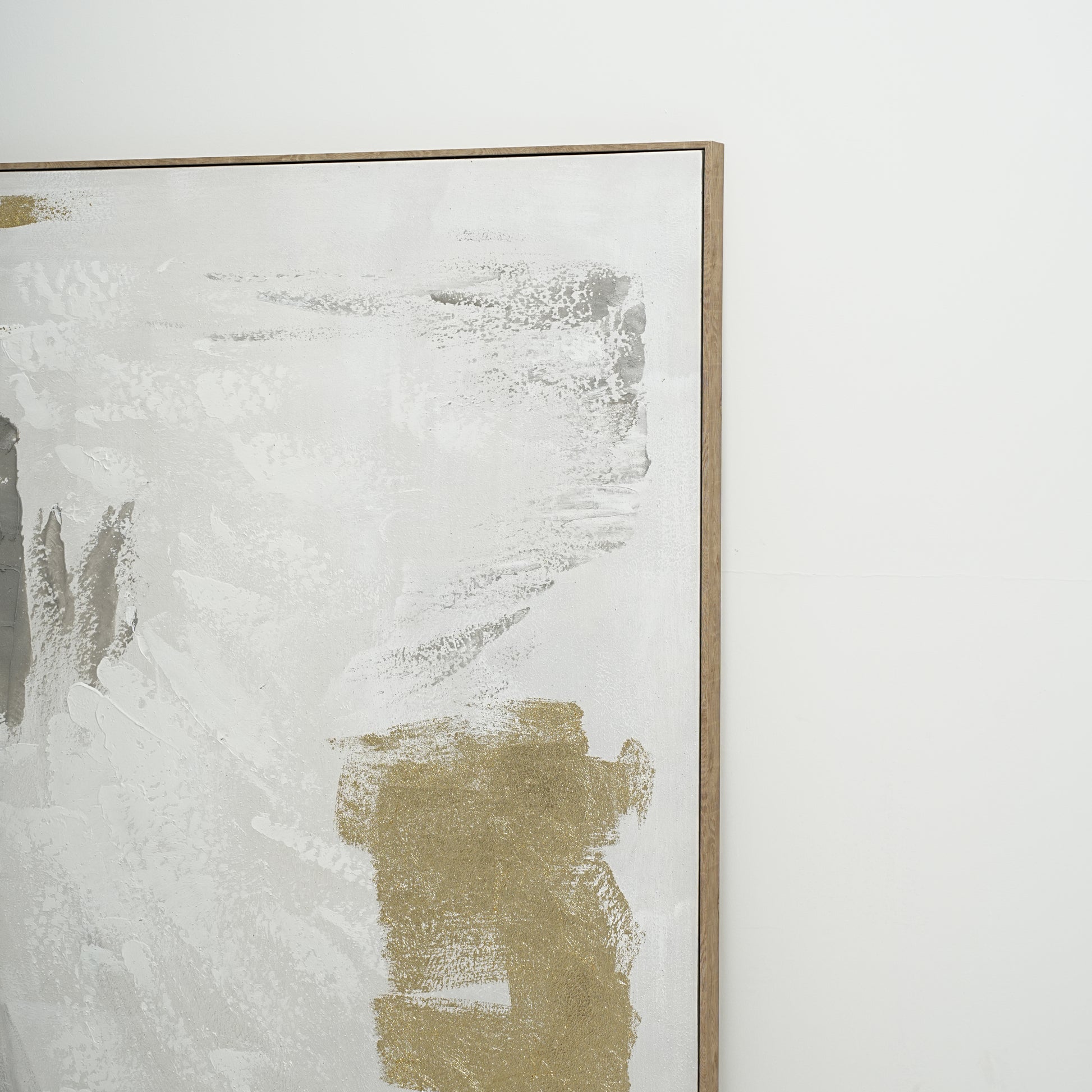 Golden Mist Abstract brings an elegant balance of softness and radiance through its refined blend of white, grey, and hand-applied gold accents.
