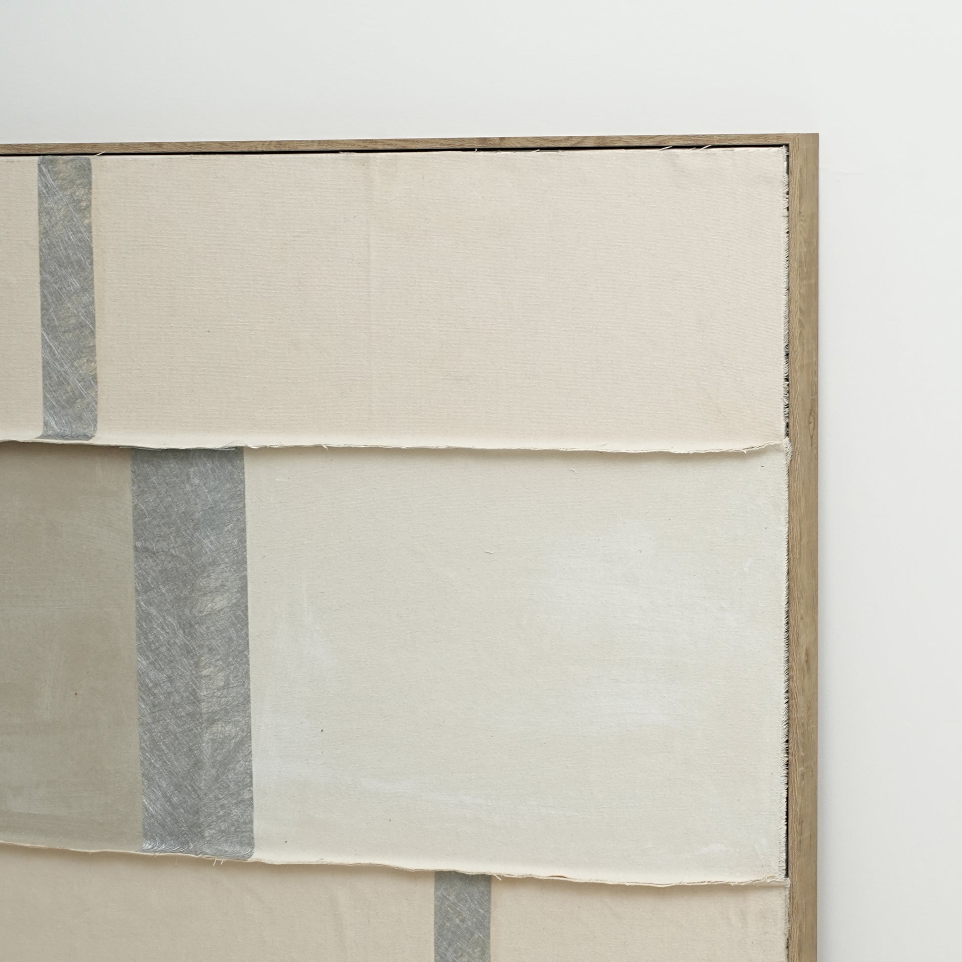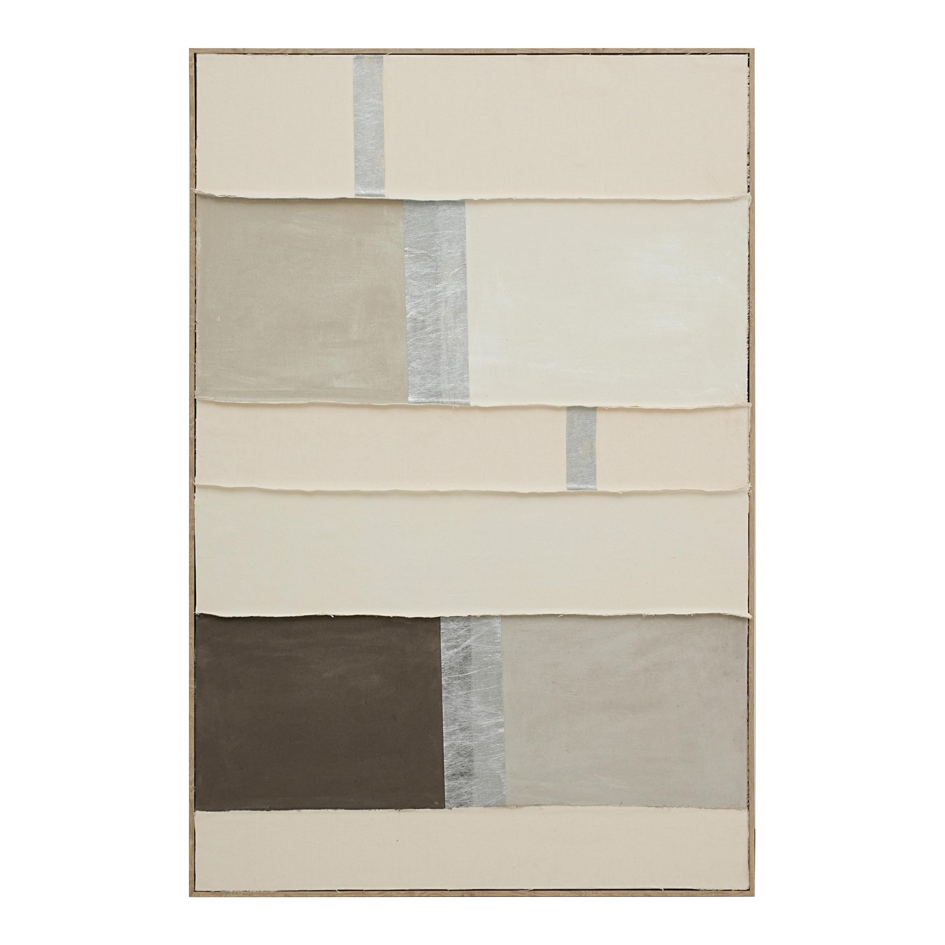 Composed of layered textile panels in soft beige, ivory, and taupe, accentuated with a touch of metallic silver fabric, this piece combines structure with warmth. Each fabric layer is carefully hand-cut, assembled, and textured to create depth, movement, and calm sophistication.