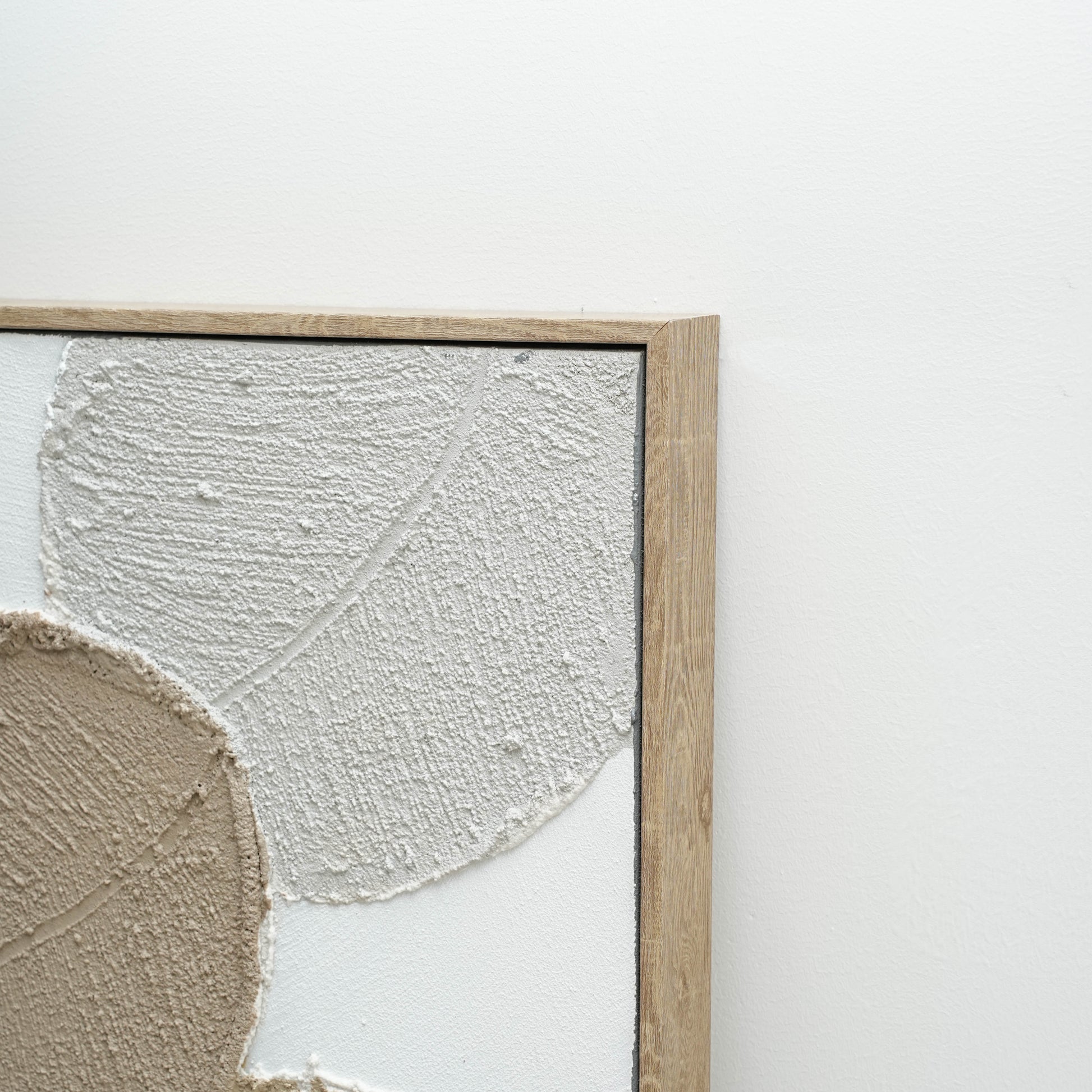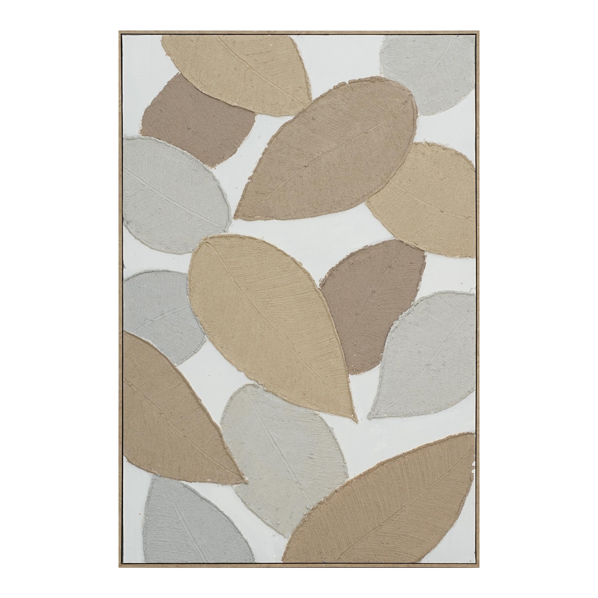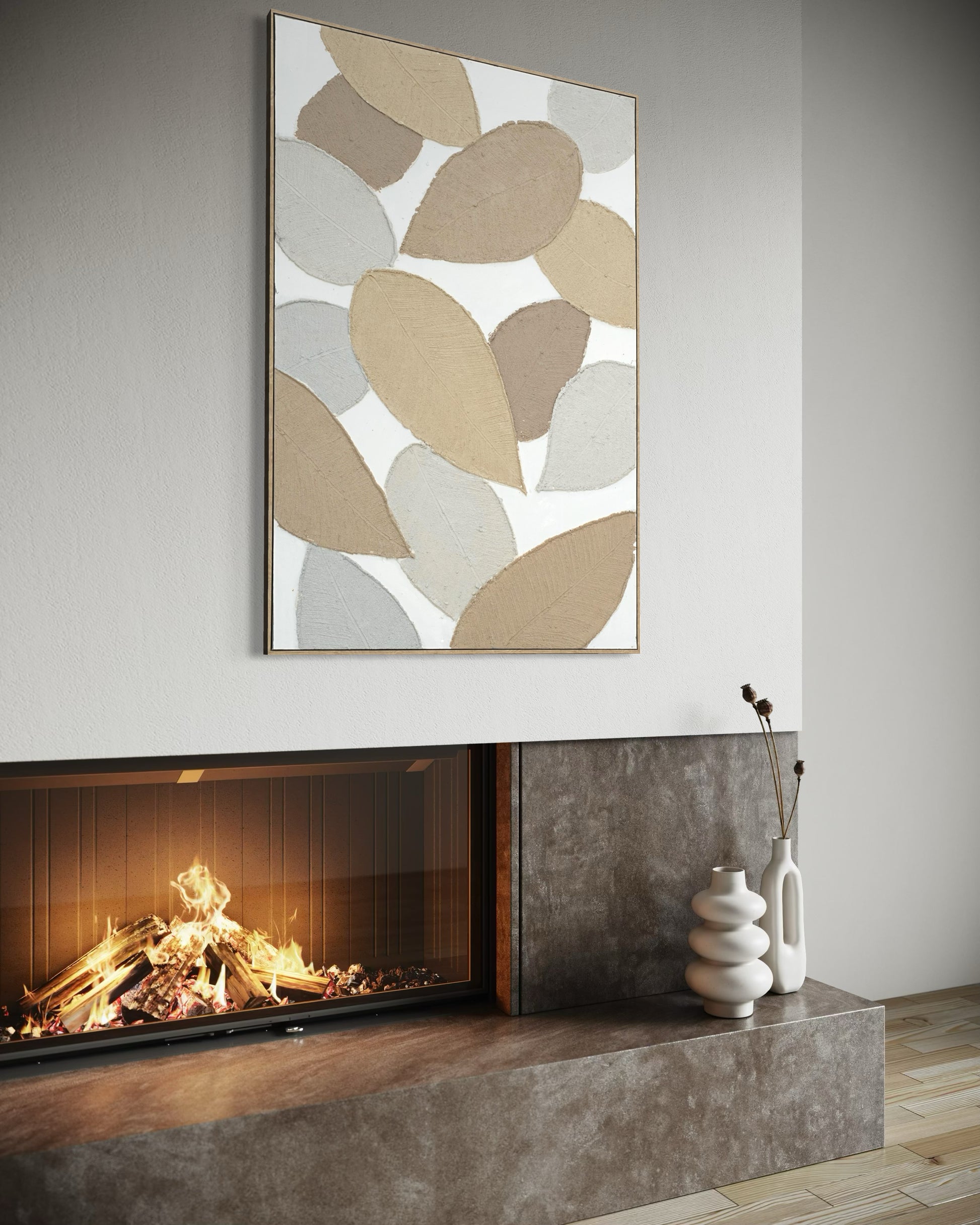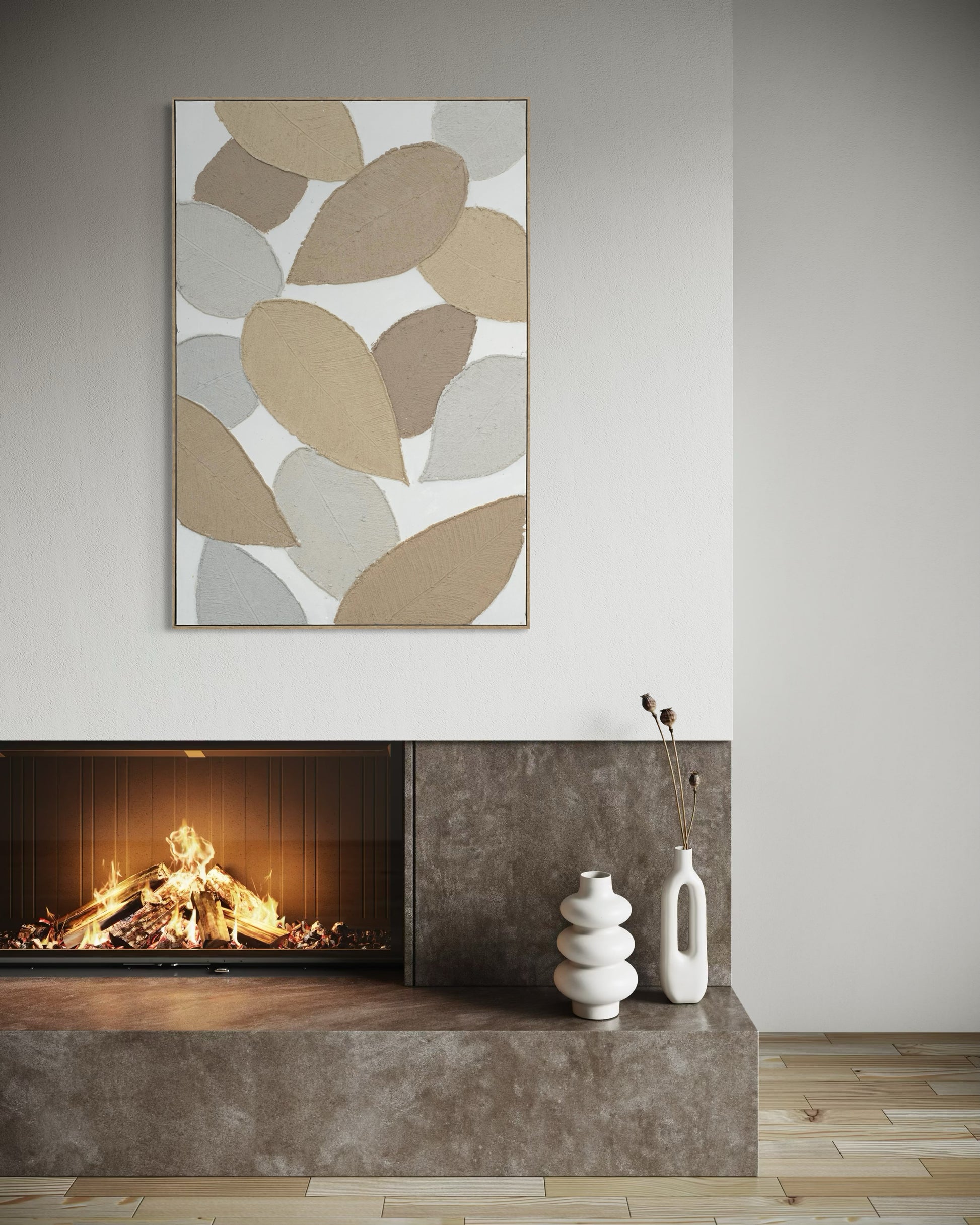 The overlapping leaf patterns in soft neutral shades of beige, taupe, and ivory create a sense of balance and simplicity. Each brushstroke and relief texture is carefully hand-crafted, highlighting the artistry of minimal natural design.